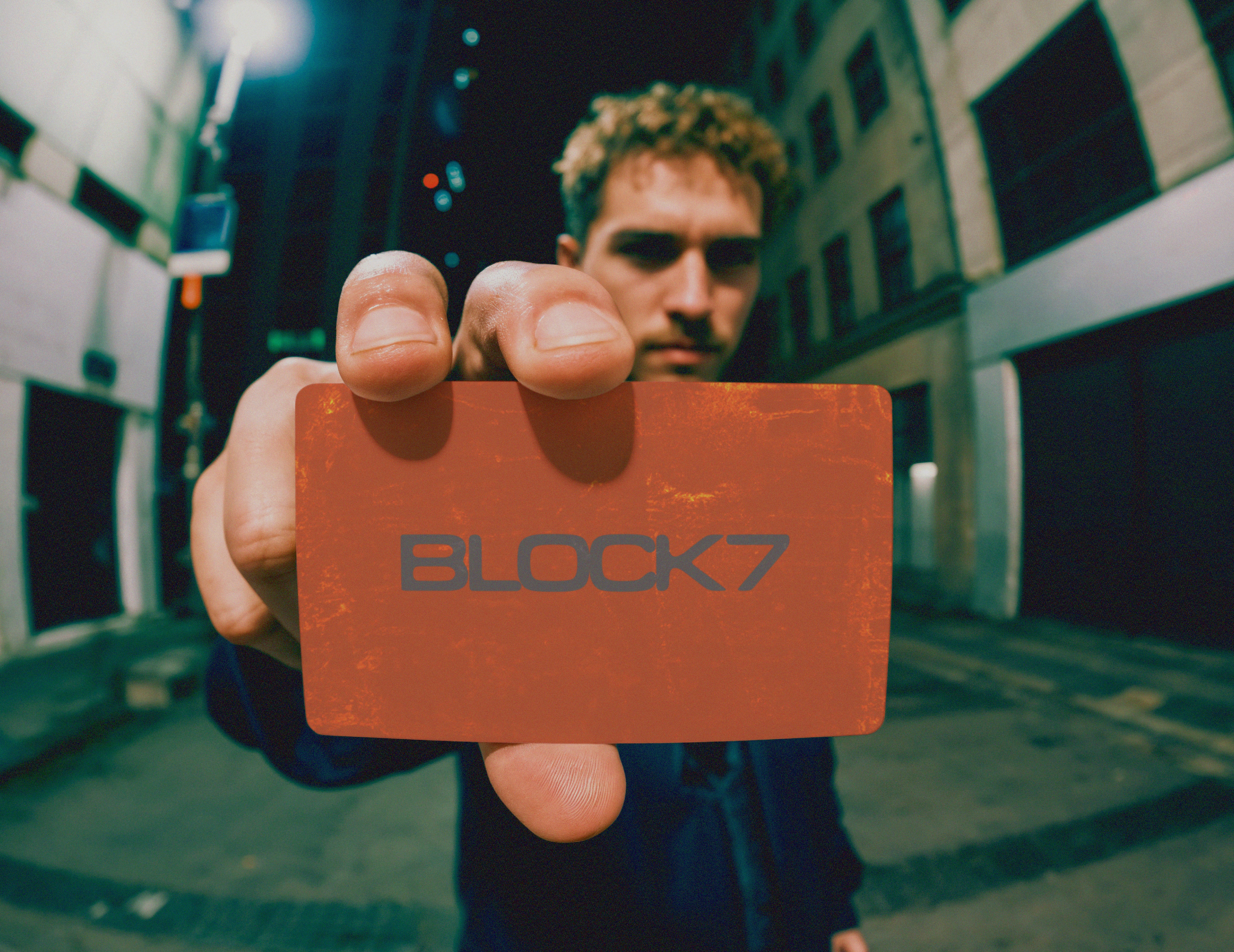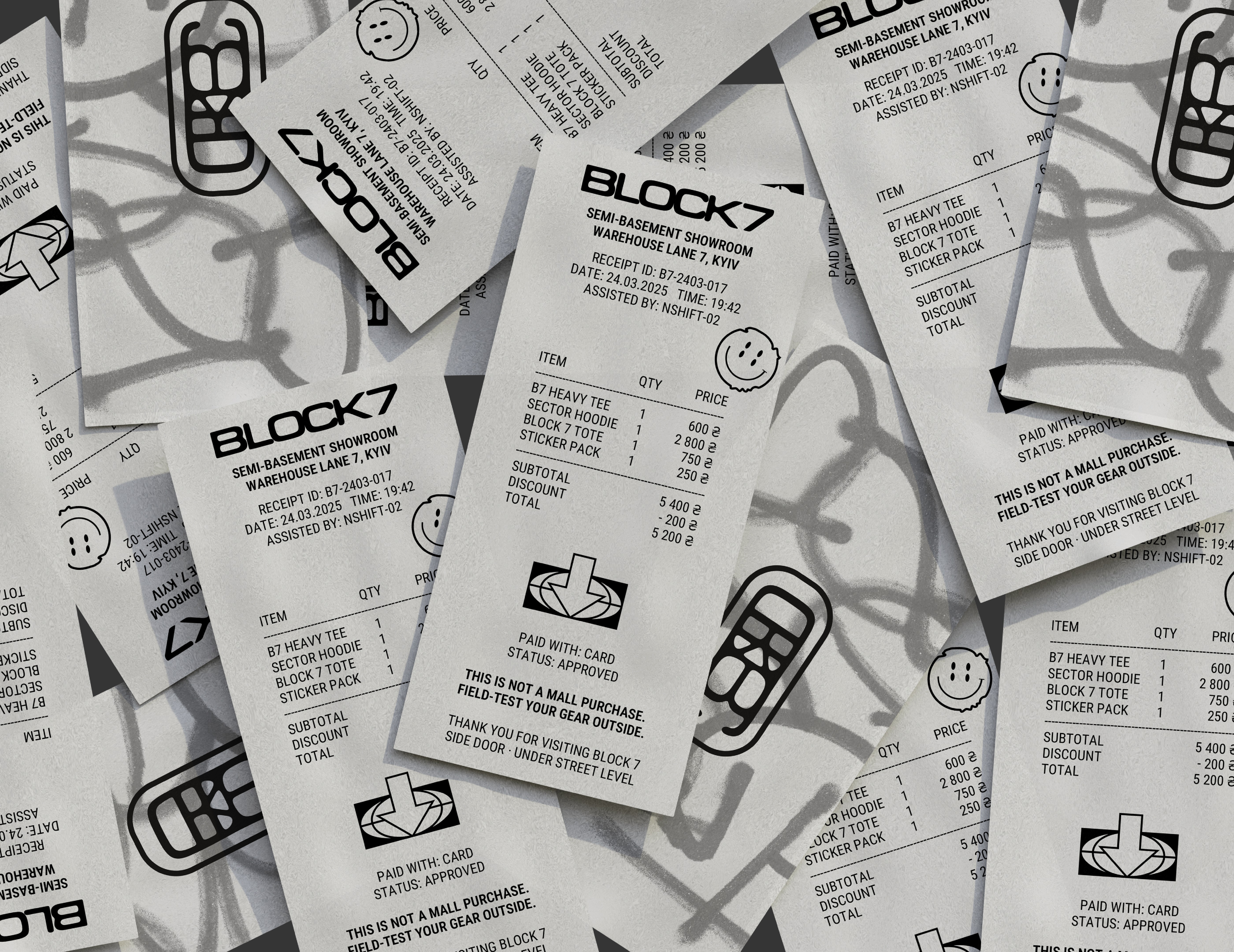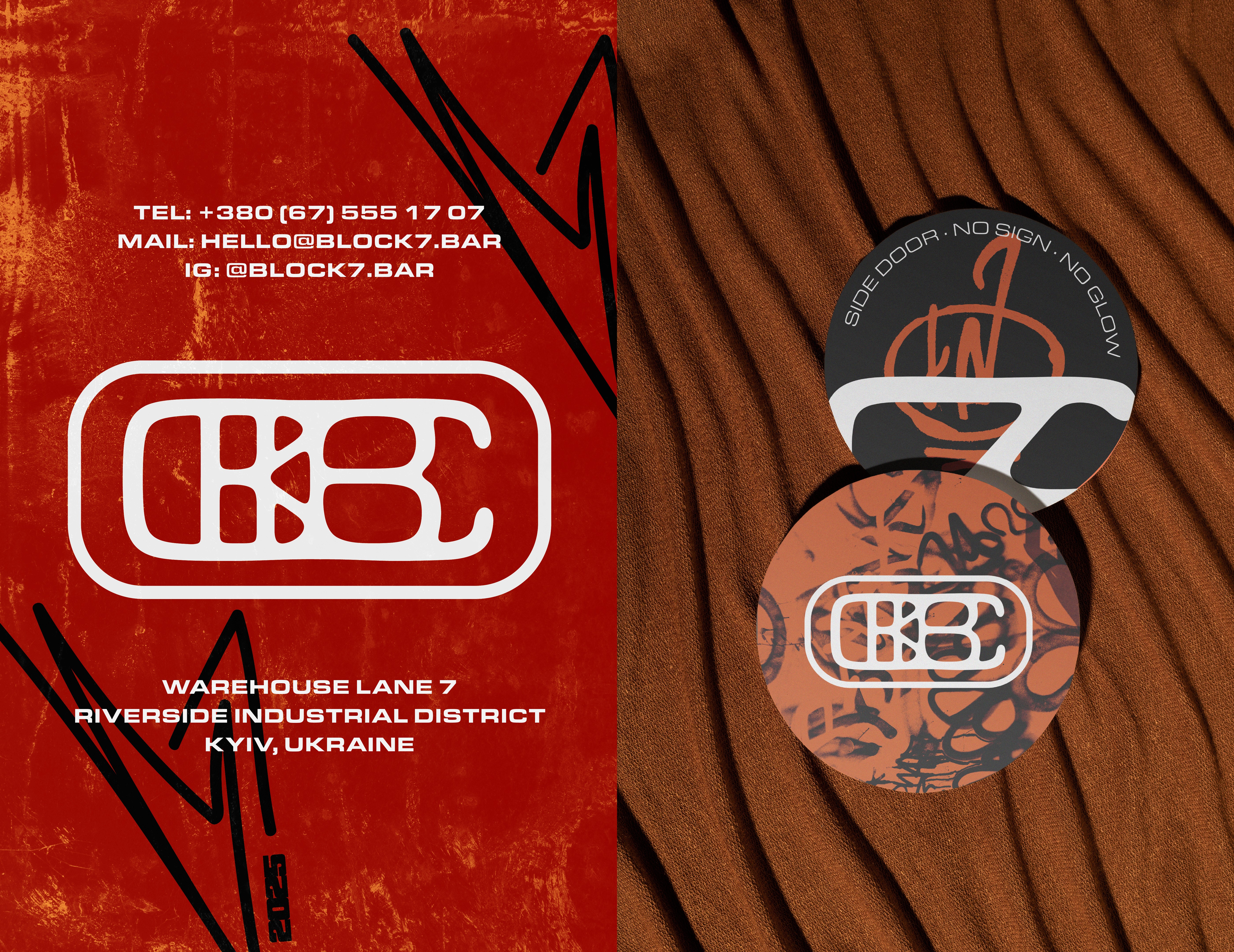 BLOCK 7 is a streetwear label and semi-basement showroom hidden in the Riverside Industrial District in Kyiv. The brand is built on rough textures, bold type and the feeling of walking through the city after dark — when neon hits concrete and every wall is a canvas. The visual system for BLOCK 7 is built around a capsule-shaped monogram, heavy typography and a limited palette of concrete grey, burnt orange and dirty black.