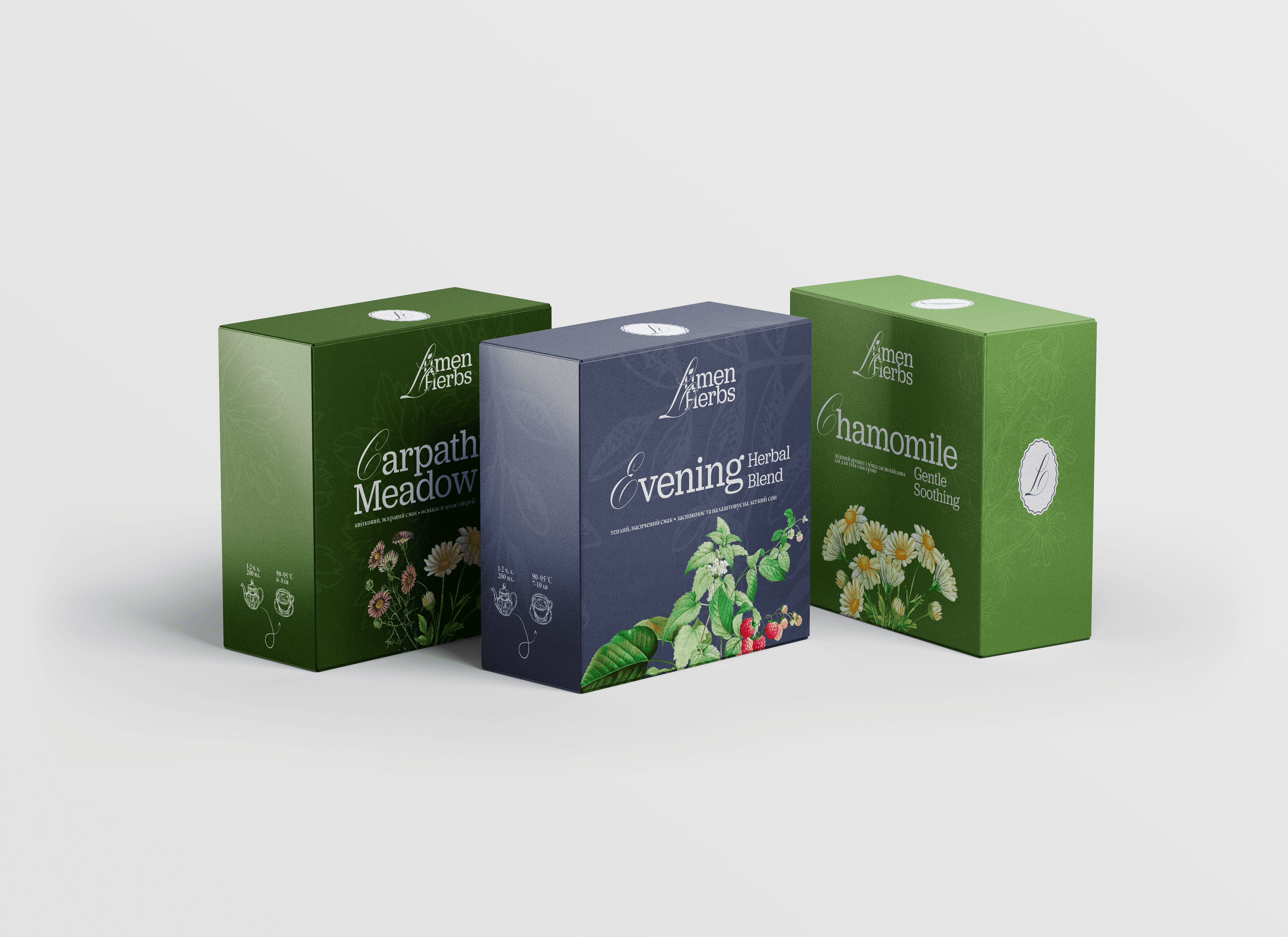 Lumen herbs is a herbal tea brand concept where the name combines “Lumen” — a reference to light — and “herbs” — the power of plants. The goal of the project was to create packaging that feels modern and structured, while still preserving a sense of calm and connection to nature. At the core of the identity is a deep colour palette of dark greens and blues with lighter accents. It helps visually distinguish different tea lines and evokes the mood of an evening ritual, warmth, and gentle self-care.
